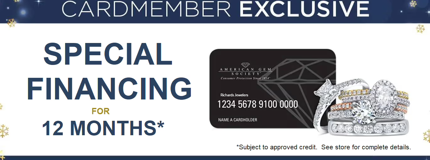 Richards Jewelers is pleased to offer special financing through our American Gem Society credit card issued with approved credit by Wells Fargo Bank, N.A. Our financing program is designed to provide a convenient and fast application process with several payment options. The American Gem Society credit card brings you these great features: